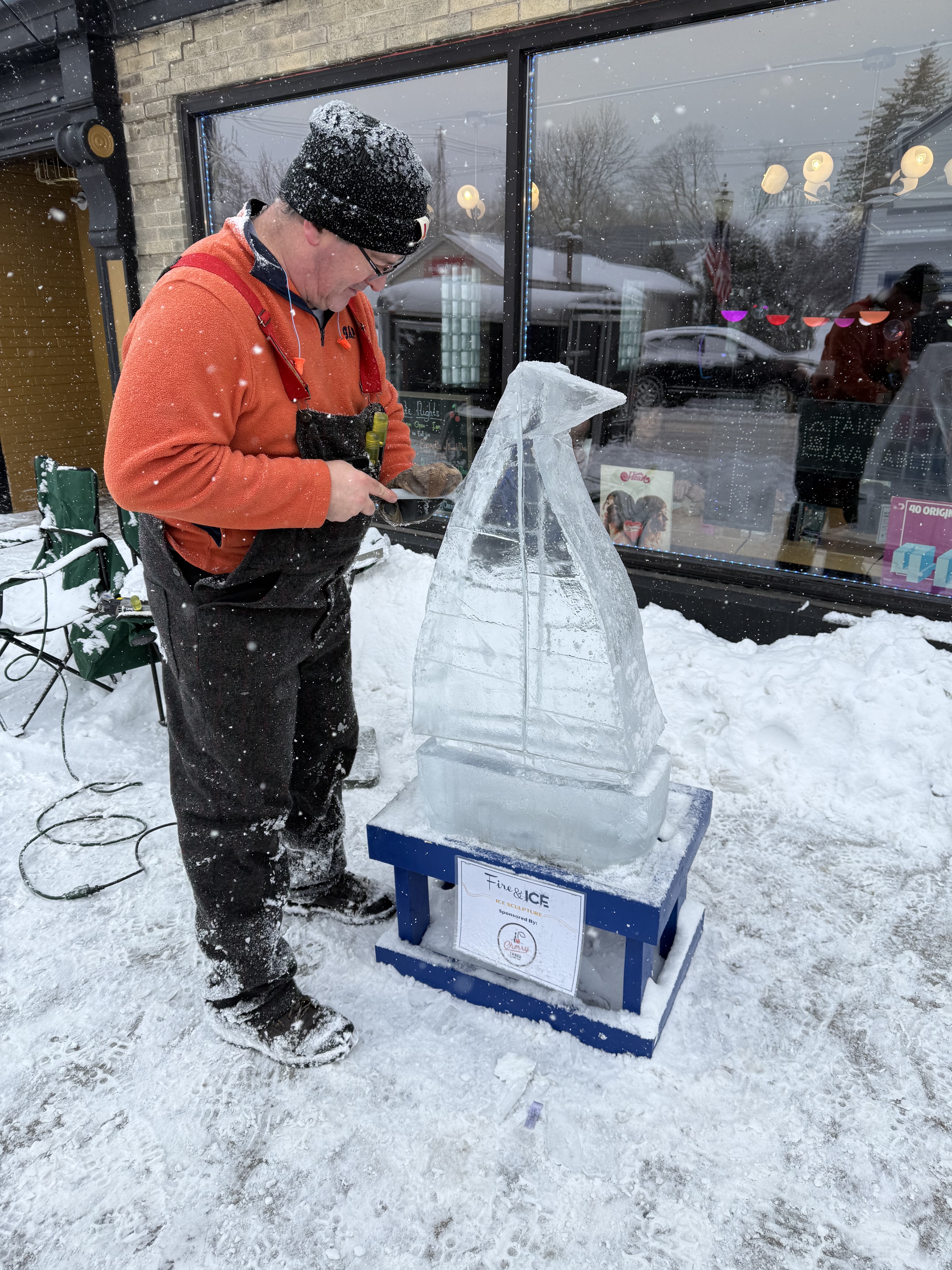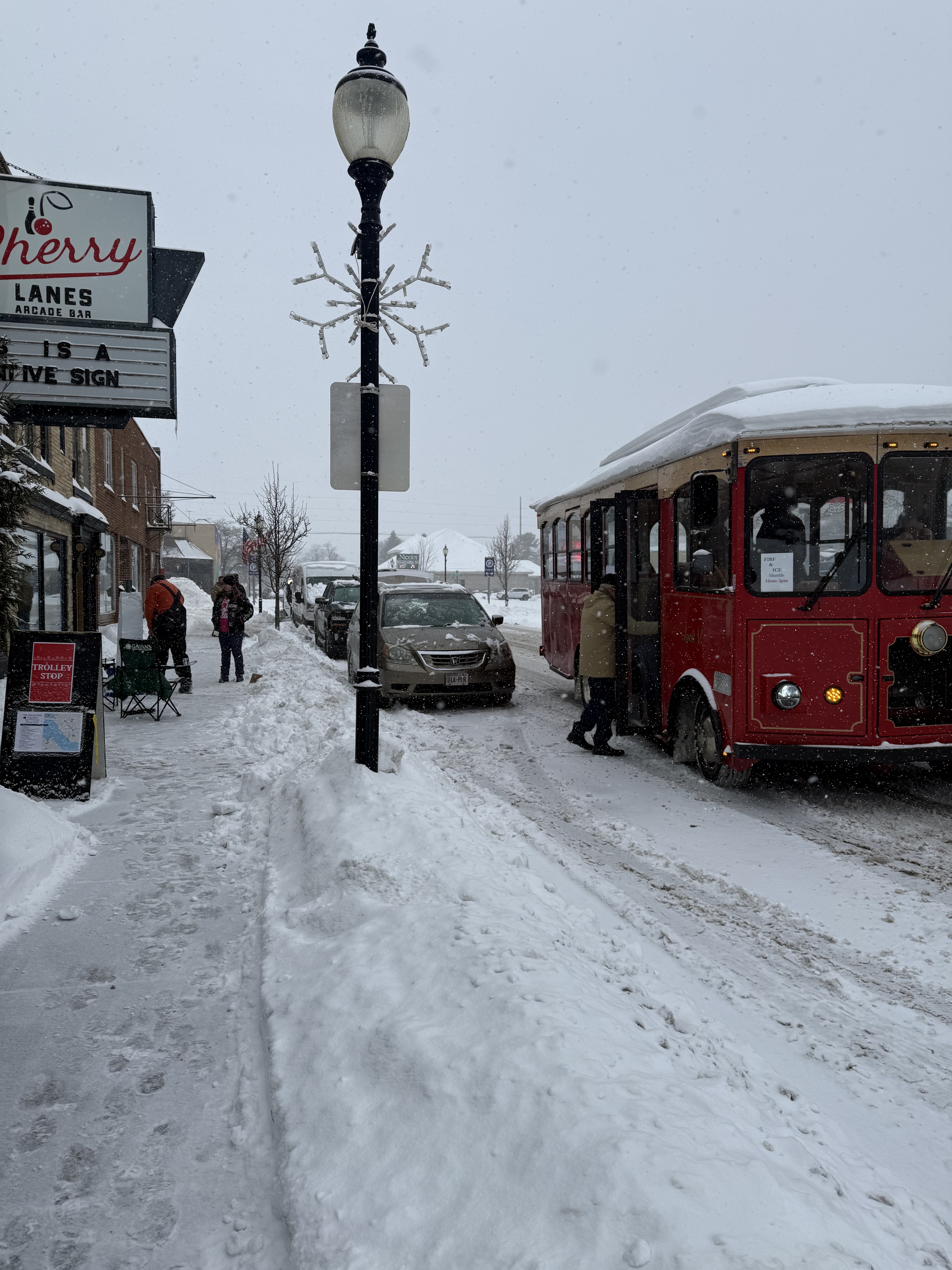 The enchanting Door County winter wonderland was breathtaking. The falling snow and ice sculptures scattered throughout downtown Sturgeon Bay. Cherry Lanes served as a Door County Trolley stop for visitors to stay warm and easily visit the dozen frozen masterpieces sculptures throughout the city. A sailboat sculpted from shimmering ice stands proudly in front of Cherry Lanes Arcade Bar. Our large windows served as the best viewing spot in Sturgeon Bay to watch the ice come to shape. The intricate details of the vessel, catching the light like a thousand diamonds, were a testament to the artistry and skill of the ice carvers.