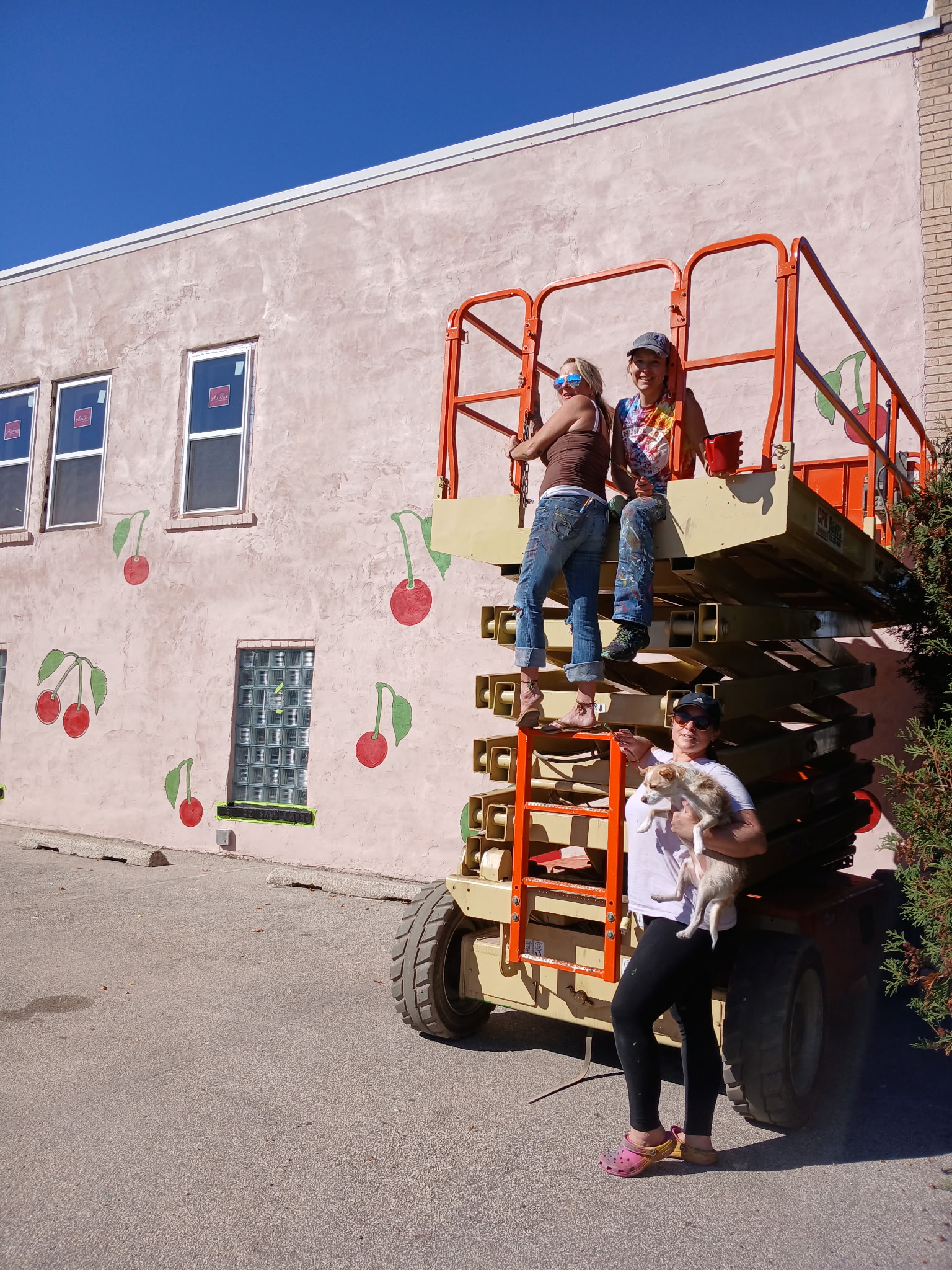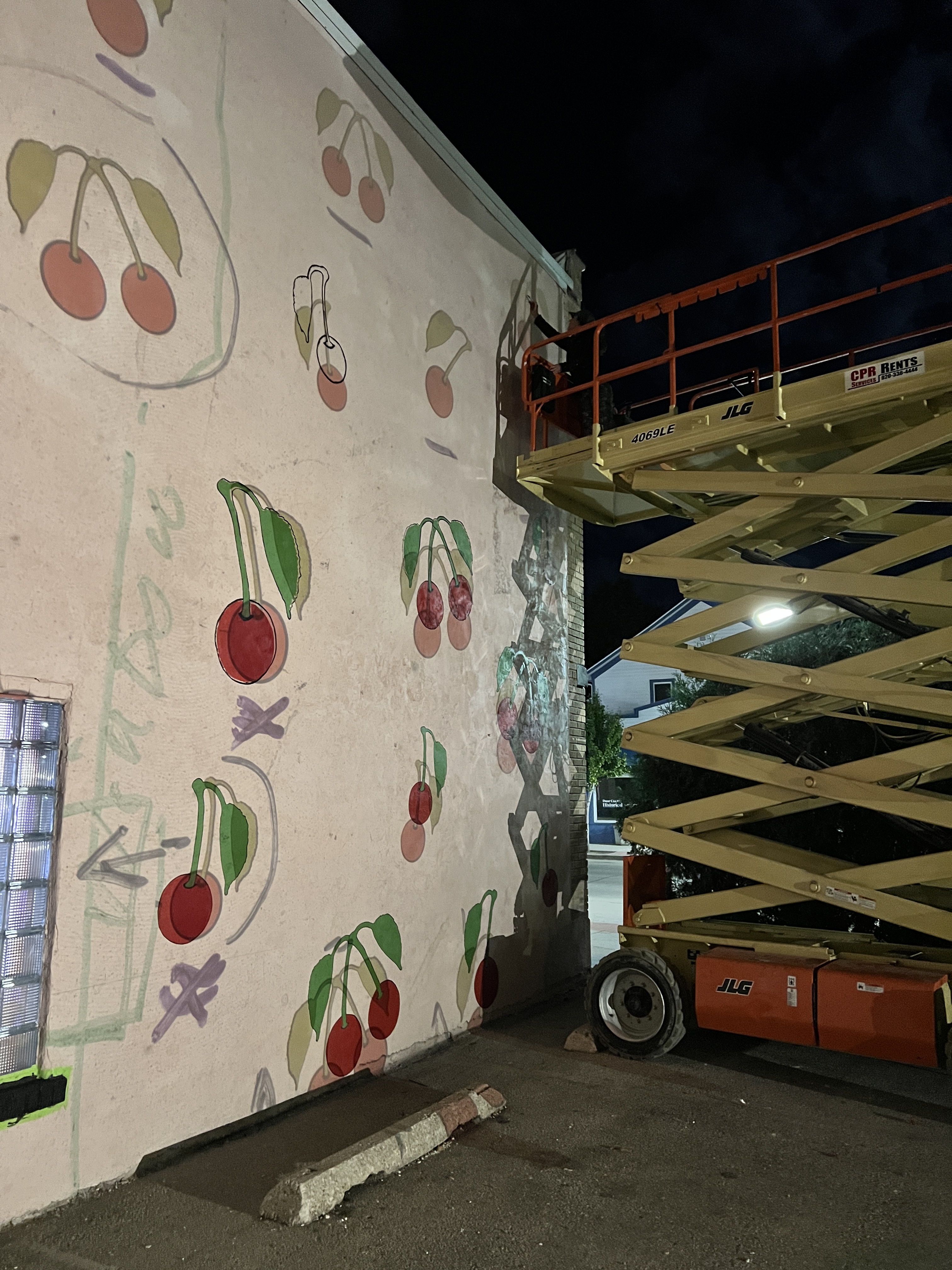 We painted a vibrant celebration of everything we love about our spot and Door County. The design features over three dozen giant cherries — some are 6 feet tall — that serve as a playful nod to our name and, of course, a tribute to the region’s rich agricultural history.